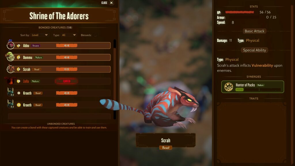 A karakterünk fejlesztése és befogott lényeink menedzselése az egy központi zónában játszódik. Itt vesszük majd fel a küldetéseket és vásárolhatunk különféle segítő tárgyakat is Lukha számára. Főzés is rendelkezésre áll számunkra, ahol különféle alapanyagokat kombinálva készíthetünk bónuszt adó ételeket. Innen kiindulva mehetünk Diablo-szerű dungeon runokba, ahol aréna harcokon keresztül juthatunk el a zóna végét jelentő jutalomig. A különféle környezetek változatosságot jelentenek a runok alatt, de ahogy haladunk előre gyorsan ismétlődővé válik a játékmenet.