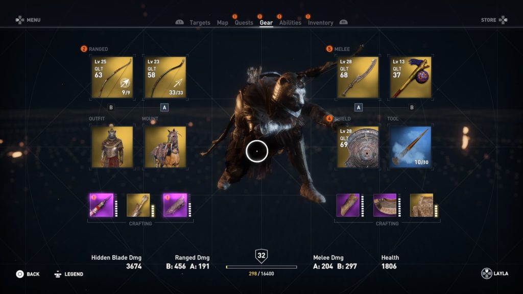 Fegyverekből eddig sem volt hiány, de amit itt műveltek a fejlesztők az bődületes, különféle kardok, dupla-kardok, pajzsok, dárdák, fejszék, hajlított pengék állnak rendelkezésre, melyek mind különféle hatásokkal és erősségekkel rendelkeznek, ritkaságuktól függően. Bizony, itt is bevezetésre került a Borderlands-féle loot-rendszer, találhatunk közönséges (kék), ritka (lila), vagy legendás (arany) fokozatú fegyvereket, de az állatokból is ritkábban hullik bizonyos összetevő. Míg a közönséges fegyverek egyetlen tulajdonsággal rendelkeznek, addig a legendásak már hárommal. Minden fegyver fejleszthető a talált pénzből, így ha egyikük másikuk a szívünkhöz nő, a játék végéig megtarthatjuk, elég csak a szintünkre fejleszteni. A felszerelésünk is erősíthető, ezekhez különféle ásványokat és bőröket kell szereznünk, melyeket leginkább a környező állatokból nyerhetünk ki, illetve hajókról és futároktól, majd egy fejlesztést követően az árusoktól is megvehetjük őket. Bizonyos árusoknál hátasokat is vehetünk, így azok között is válogathatunk kedvünkre. A játék sikeresen megörökölte a képességfát is, rengeteg megnyitható és minket segítő tulajdonságot szerezhetünk, az altató-nyíltól kezdve, egészen a mellettünk harcoló állatok befogásáig.