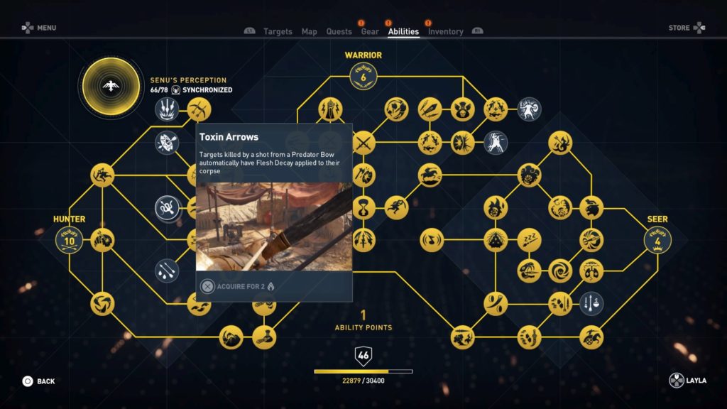 Bővült a képesség-fa is egy erőset, hét új dologra költhetünk, közöttük egy, csak a Túlvilágon alkalmazható, automatikus nyíl és darts/bomba újratöltödésre, illetve az íjainkat erősítő fejlesztésekre is. Ezeket érdemes kimaxolni, mert a fáraók elleni harcok bizony izzasztóak lehetnek, hála a brutális sebzésüknek és életerejüknek, de ezek használatával és a többi felszerelésünk erősítésével ezt könnyebbé tehetjük. Felszerelésünket további két lépcsőfokban fejleszthetünk, melyekhez már az említett csillag-töredék kell a Carbon Crystal helyett, bár azokból is találhatunk még a ládákban dögivel.
