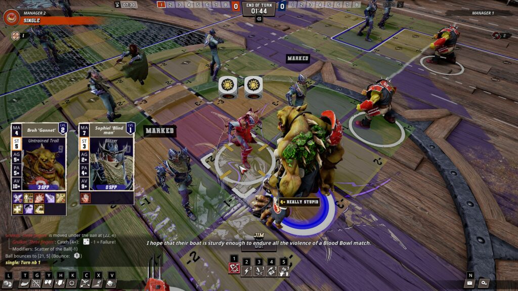 A játék körökre osztva történik. Két félidő van 8-8 körrel. Minden kör egy úgynevezett „Turnover„-ig tart. Ha ez bekövetkezik, a körnek azonnal vége és az ellenfél köre kezdődik. Egy kör során a karaktereink vagy Move (léphet a pályán, ellenséges játékos környékén kockával dob, hogy elgáncsolják-e) vagy Block (egy másik játékos megtámadása) akciót hajthat végre. Ezen felül körönként egyszer végrehajthatunk egy extra akciót is: Blitz – Move és Block is egy körben; Foul – Move és egy földön fekvő játékos megtámadása, esetleges kiállítás; Pass – Move és labda eldobása vagy csak a labda eldobása. Némelyik karakter a saját csapattársát is eldobhatja (pl.: Troll a goblin társát); Hand-Off – Move és a labda átadása kézbe. Lehetnek még a karaktereknek is képességei, amelyeket felhasználhatunk akcióként, például a Troll Projectile Vomit skillje.