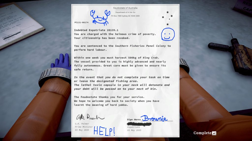 Nem tudom, hogy a következő a játék hibájának számít vagy a sajátosságának, de a játék semennyire nem intuitív, mert a játékban konkrétan semmi tutorial nincs. Ahogy kirak minket a játék a hajóra, onnantól nekünk kell kitalálni, hogy mit, hol, hogyan, miért. Van egy-két ilyen írásbeli dokumentum, amit meg lehet szerezni, ezeken lehet elolvasni az eszközök meg a hajó működését, de igazából ez se sok segítség. Elég naivan kezdtem bele a játékba, mivel arra számítottam, hogy minden alapvető dolgot tudatni fog velem a játék különböző tutorialok (vizuális és nem csak írásbeli) segítségével, de nem ez történt. Olyan érzés mintha egy szabadulószobában lennénk. Ez különösen azért nehezíti meg a játékos dolgát, mert a különböző dolgok kezelése összetett, és így annak lehet főleg nehéz dolga, aki nem ismeri szakmailag a halászhajók működését. Valamint csomó életbevágó dologra nem lehet magunktól rájönni, például hogy hol kell újratölteni a csalit (a ChatGPT-től tudtam meg, hogy egy állomáson, ami egyébként a térképen egy kis hal ikonnal van jelölve). Valamint nálam az is előfordult, hogy lőttem ki a szigonyt a zsákmányra és nem kapta el, és én eleinte azt hittem, hogy túl messze vagyok, majd kiderült, hogy a korábban kihalászott és egyben már üres ketrecet vissza kell tenni a hajóra, mert anélkül nem lehet újabb zsákmányt kifogni. A másik amit szintén nem árul el nekünk a játék, és nekem a játék elvesztésébe került, hogy a kifogott rákokat le kell szállítani (szintén a hal ikonnal jelzett területen), és hiába van meg a teljes kvóta az idő lejártakor, mert ha nincs leszállítva, akkor a játék úgy végződik, hogy vesztettünk, de igazából ez is egy lehetséges befejezés.