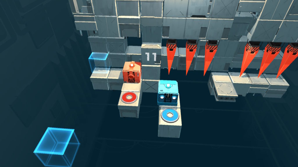 Talán már sikerült összekapcsolni az információmorzsákat, hogy két robotunk van, és két Joy-Con, így bizony lehetőségünk nyílik egy barátunkkal (aki nem biztos, hogy a játék végére is az marad) együtt játszani, de annak sincs akadálya, hogy egyedül terelgessük a robotokat. Mivel a két Joy-Con egy-egy karaktert szimbolizál, így gyakran előre kell gondolkodni, illetve megismerni a pályát, mert sokszor fogunk meghalni a rejtett csapdák miatt.