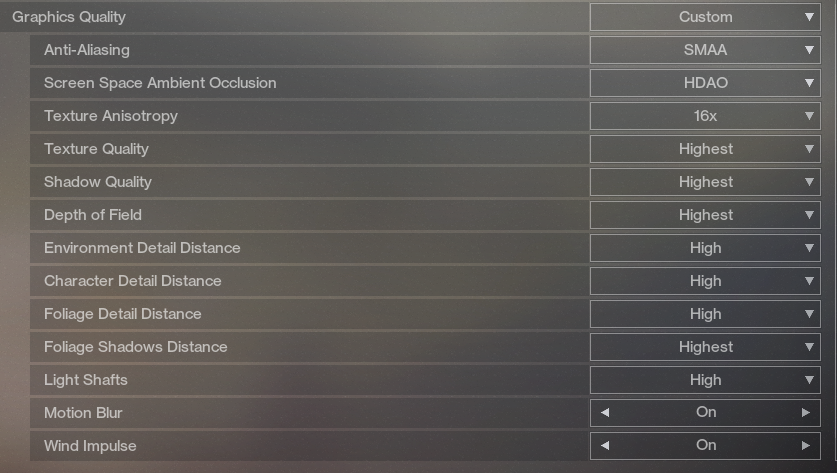 Négy alapbeállítással találkozhatunk: low, medium, high és highest. Ha ezzel nem vagyunk megelégedve, akkor ott a custom lehetősége, ahol ezeket mind kézzel állítgathatjuk az ízlésünk és grafikus teljesítményünk szerint. Felül közben folyamatosan nézhetjük, hogy mennyi vram-ra lesz szükségünk az adott beállítások mellett. Kezdjük is el a PC-n „szükséges” beállításokat sorban.