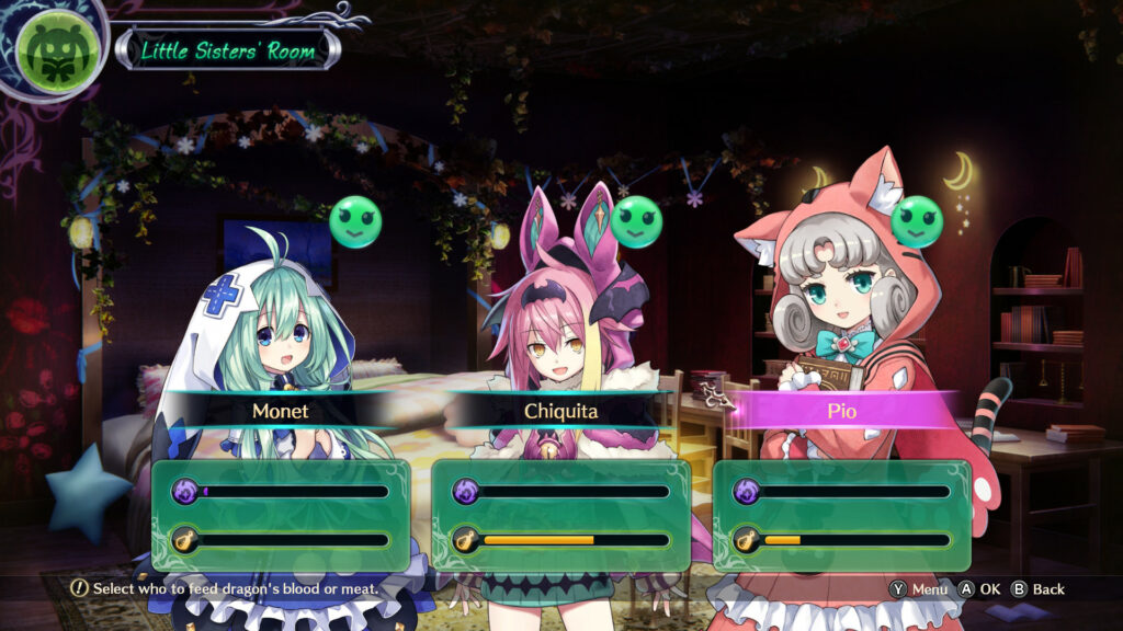 A karakterfejlődés azonban nem csak a hagyományos RPG módokon történik, ugyanis, mint sok más JRPG-ben is, a történet szempontjából is nagyon fontos aspektus is szerepet kapott. A küldetések között meglátogathatjuk a boszorkány társainkat, és ajándékokat adva nekik erősíthetjük a kapcsolatainkat velük. A társaink mellett, a játék ránk bíz három „kishúgot” is, akiknek az etetése a mi feladatunk lesz a játék során. Ezen három karakter sorsa teljes mértékben a mi akcióinktól függ. Ha nem etetjük őket, vagy épp túletetjük őket, akkor a sárkányátok által sárkányokká változnak, és az egyes dungeon-ok főellenfeleivé válnak. Ez hatalmas hatással lesz majd a történet végére is, és a legjobb végkifejlet eléréséhez mindhármukra vigyáznunk kell, a játék teljes hosszán keresztül.