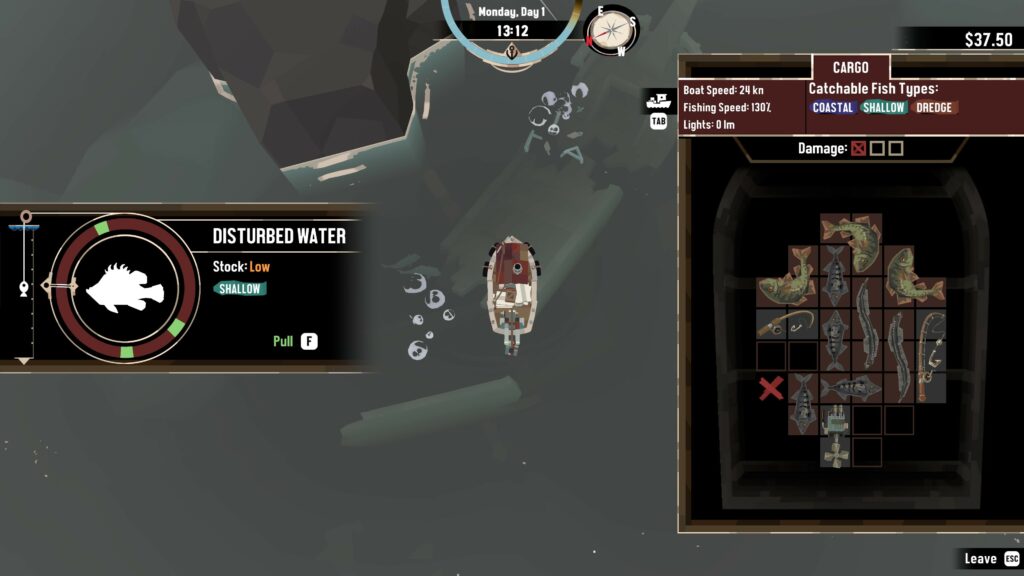 Nagyon kellemes QTE alapú mechanikával húzzuk ki sorra a halakat a tengerből. A gameplay loop lényegében a következő: elhajózni egy horgászható helyhez->a hal típúsának megfelelő ritmusban kihúzni a halat a vízből->a hajónk limitált tárhelyébe beforgatni a fix alakzatú és méretű rakományt. Ezeket aztán a kikötőkbe érve különböző boltokban eladhatjuk és az így szerzett pénzből fejlesztéseket vásárolhatunk. Természetesen a hajó további felszerelései hasznos tárhelyet vonnak majd el a raktérből, így mérlegelnünk kell a fejlesztés hasznosságát.