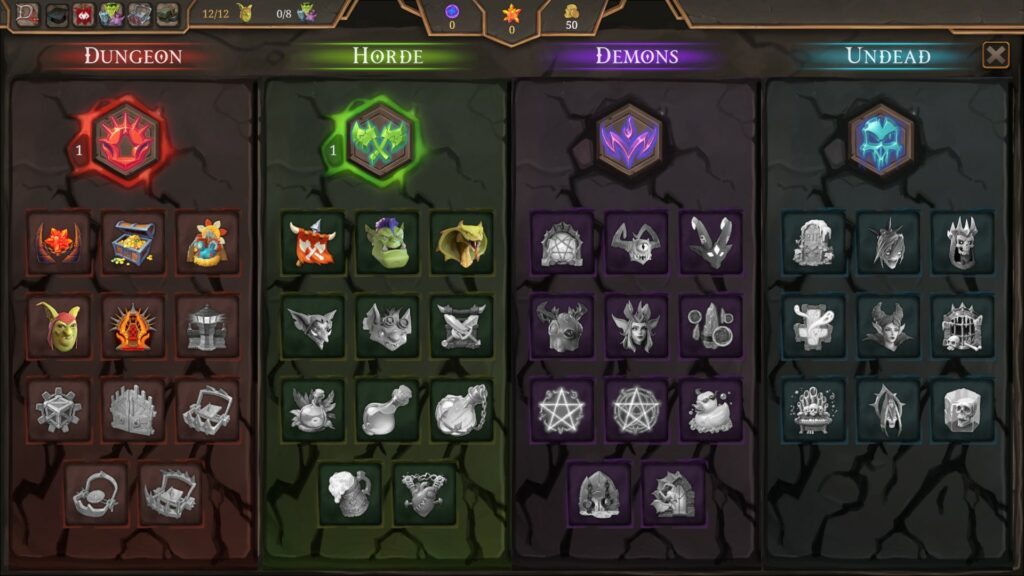 A pályák során négy ágból álló fejlesztési fával oldhatjuk fel az épületeket és a technológiákat. Ezek a történet alatt lassan válnak elérhetővé és némi magyarázó történet is jár mellé, amikor megkapjuk őket. A Dungeon ág főként a termelés és a bázisvédelem elemeit tartalmazza. A Horde ágon viszonylag olcsó egységeket szerezhetünk és a fa végén bónuszokat adó főzeteket gyárthatunk. A Demons ágon varázslatokkal rendelkező démonokat kapunk és megnyílik a mana/spell rendszer, amivel hatalmas előnyre tehetünk szert a felszíni csatákba. Az Undead ág pedig a halott vagy legyőzött egységekkel foglalkozik és élőholt egységeket tud gyártani. A hullákat a temetőbe, az elfogott egységeket a börtönbe zárhatjuk.