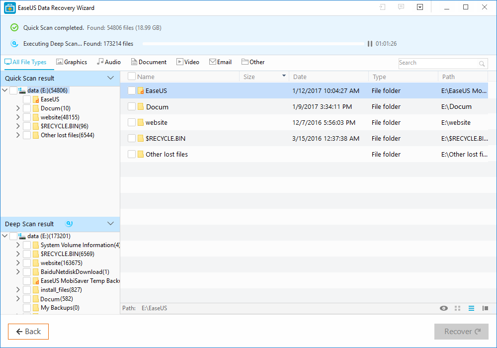 Sebesség tekintetében körülbelül az átlagos adat-visszaállító programok szintje fölött mozog az EaseUS. A gyorskeresés opció nagyjából egy-két perc alatt végez, és már önmagában számos fájlt hoz elő, míg a részletesebb keresés képes órákig eltartani. Tesztelés során egy 1 TB-os winchestert és egy 120 GB-os SSD-t használtunk. Előbbinél a teljes idő körülbelül másfél óra volt, úgy, hogy nagyjából a merevlemez háromnegyede volt lefoglalva, utóbbinál körülbelül fél óra, szintén 75%-os foglalási aránnyal. A helyreállítás azonban semelyik winchesternél nem vett igénybe pár percnél többet.