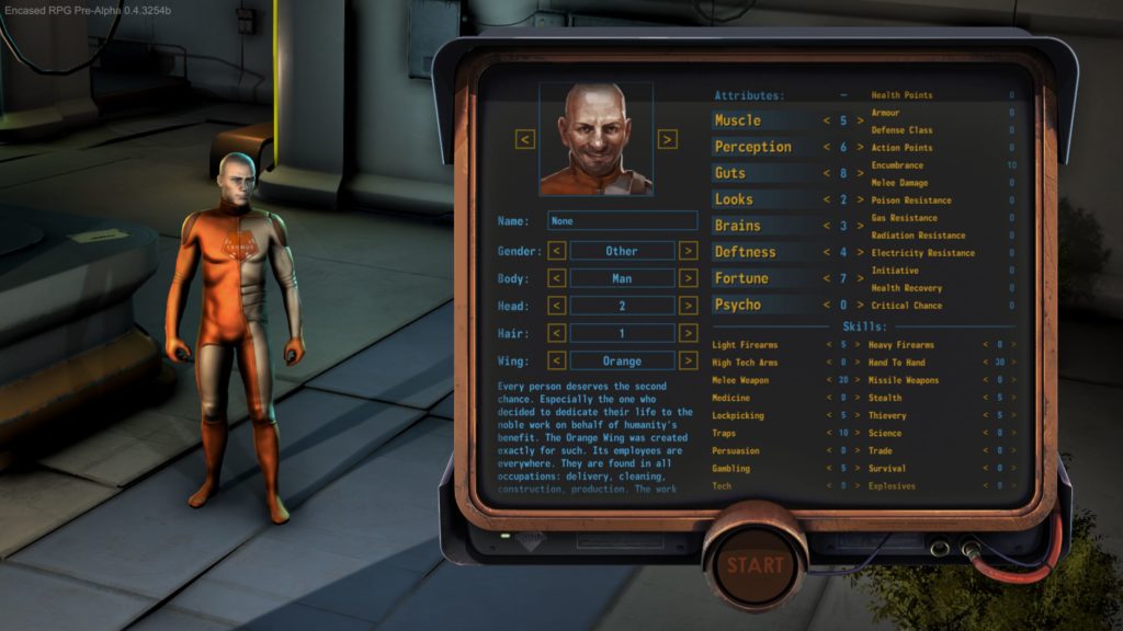 Bárki, aki valaha játszott hasonló, Fallout vagy Divinity szerű RPG játékkal szinte gondolkodás nélkül vetheti bele magát a kalandokba. A karakterkészítés során 8 fő képesség között oszthatjuk el pontjainkat, melyeket számos másodlagos és kiegészítő képesség követ, nem beszélve a szakértelmekhez tartozó perk követ. Ezek többsége a harchoz tartozik, eléggé egyértelműek és nem igazán újítják meg számottevően a zsánert, azonban teljesen megfelelnek a mai RPG-k normáinak. Sajnos a korai hozzáférés keretében nem lehet még mindet kipróbálni, azonban így is látszik, hogy elég széles tárházból lehet majd válogatni. Karakterünknek választhatunk háttér-történetet is (a játékban wing-nek (magyarul: szárny) hívják), mely az eredeten túl a Dómban betöltött szerepünket is meghatározza. Ezek amúgy ötletesen szín-kódolva is vannak, mely a ruházaton is meglátszik: a narancssárga a világ bűnözőit jelöli, akik többnyire a munkásosztályt adják, a fehér a tudósokat, az ezüst a vezetőket és a fekete a biztonsági szakembereket. Az, hogy milyen eredettel kezdünk a játékot is nagyban befolyásolja. A saját kasztunkhoz tartozó karakterekkel könnyebben tudunk szót érteni, míg például biztonsági őrként vajmi kevés esélyünk lesz egy bűnöző bizalmát elnyerni.