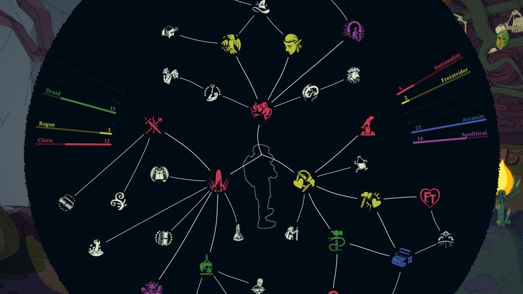 Míg a Disco Elysium a szürreális noir, a Twin Peaks és a posztszovjet melankólia talaján állt, az Esoteric Ebb inkább a klasszikus fantasy alapjaiból merít, de teszi ezt egy egészen sajátos, néhol a Shrek világában látott kifacsart humorra emlékeztető stílusban. A humor itt az egyik fő elem, és bár nem feltétlenül viccesebb, a Disco Elysiumnál, az okosan bedobott poénok és az abszurd helyzetek száma jóval magasabb. A jól ismert D&D elemek, mint a tulajdonságok, kasztok vagy jellemek, ne tévesszenek meg senkit: a környezet sokkal közelebb áll a Planescape elvont, komorabb, már-már idegen világához, mint a megszokott, varázslatos fantasy birodalmakhoz.