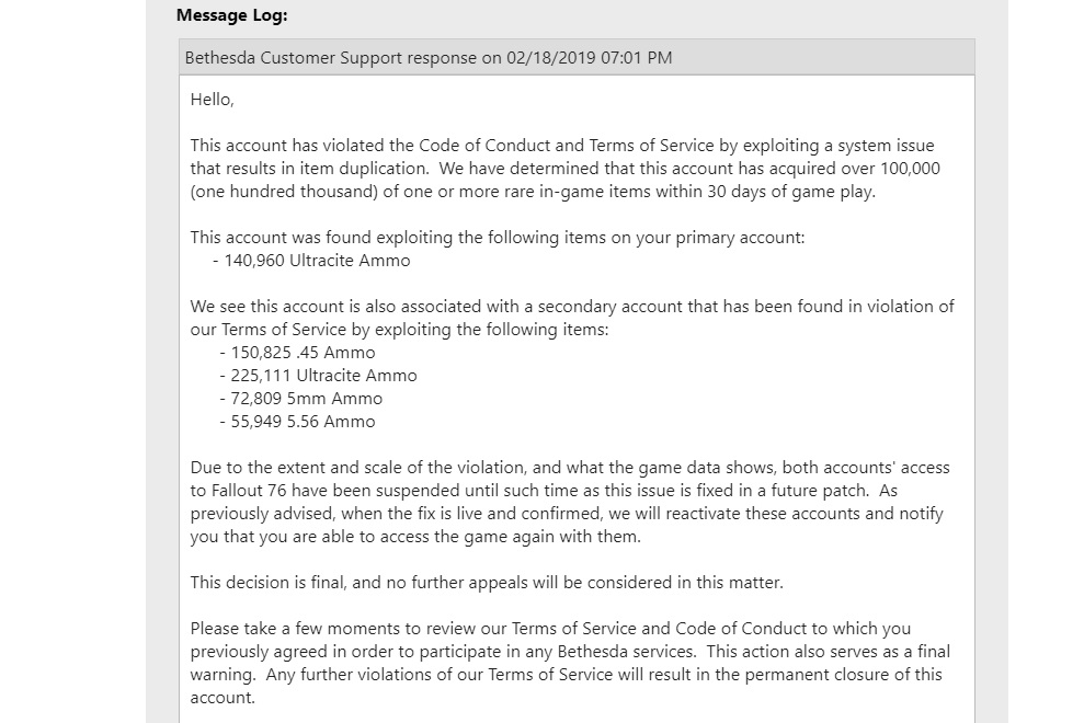 Egy játékos aki 900 órát végszenvedett játszott és most a „következő patchig, ami javítja a hibát” kibanolták, mert túl sok lőszer volt nála. Elvileg az említett account több, mint 100000 rare in-game tárgyat szerzett az elmúlt 30 napban. A játékos állítása szerint a hosszú játékideje alatt szimplán kifarmolta a lőszereket, ezért nem is érti, hogy miért banolhatták. A community-manager nyomoz épp az ügy miatt, hogy