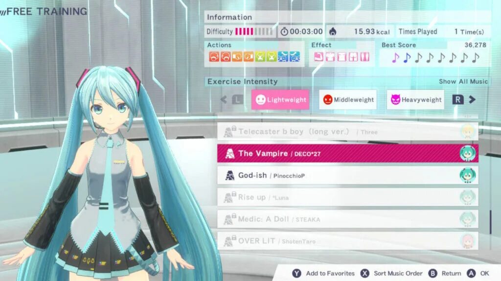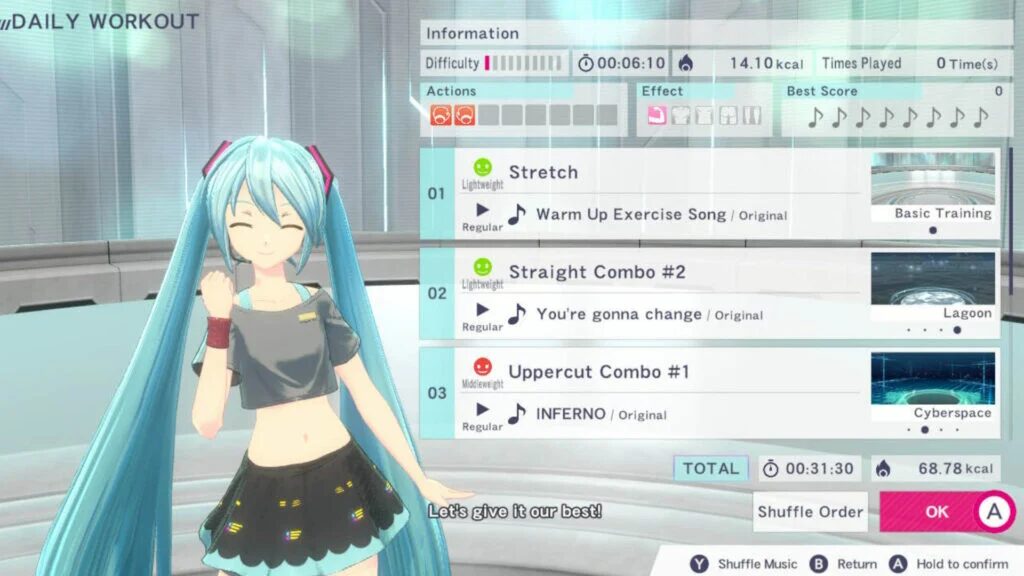 A Fitness Boxing feat. Hatsune Miku pontosan azt adja, amit a címe sugall. Az edző utasítására kell végrehajtanunk a gyakorlatokat, miközben az még a helyes testtartásunkat is figyeli. Közben egy általunk választott Vocaloid bokszol, lényegében csak velünk szemben – mint a táncosok egy Just Dance játékban, és bátorítóan ösztönzéseket kiabál felénk. A játék akkor is megtartja ezt a „kedves”, ösztönző stílust, ha elrontjuk a kombót, és ez a pozitív visszajelzés segít abban, hogy egy könnyed játék érzését keltse, ahol nem kell tartanunk a hibázástól. A játék számos játékmódot tartalmaz. Például a Miku Exercise módban egy Vocaloid dal ritmusát követve kell bokszolnunk. A dalválaszték rendkívül sokszínű, ott vannak a klasszikusok, mint a „Melt” vagy a „The Vampire”, a „Melancholic” és „World End Dancehall”.