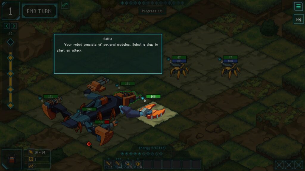 A harc egy 3×3-as területen történik. Minden fegyvernek megvan az az ertéke, hogy a területen belül mekkora hatékonysággal sebez. Például a legelső rákolló-szerű fegyver a közeli egységeket teljes sebzéssel, a távoliakat már csak 25% csökkentéssel rombolja. Ez is egy nagyon fontos szempont lesz a moduljaink kombinálásával, ugyanis támadásmódokat is kifejleszthetünk nem csak fegyvereket. Például ha a bal oldali egységeket éppen csak megsebesítjük, akkor berakhatunk egy modult, ami egyenes vonalban előre sebez, ezzel erősítve a fegyvert.