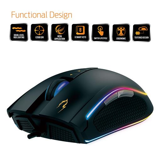 Világítását tekintve már említettem, hogy van egy Gamdias logó a hátoldalán, ezzel nem lehet annyit játszani, a színeket tekintve csak pár lehetőségünk van, és csak az egéren lévő gombbal lehet váltani. Ellenben a Hera alkalmazásnál lehet állítani, hogy folyamatosan világítson vagy lüktessen (itt két lehetőség van, hogy gyorsan vagy nagyon lassan váltson). Ezenkívül még két RGB világító csík kapott helyet az egéren. Az egyik szokásosan fent van, körben, a másik viszont egészen az alján. Ezek szinkronban vannak, és az adott részeknél ugyanúgy világít a két csík.