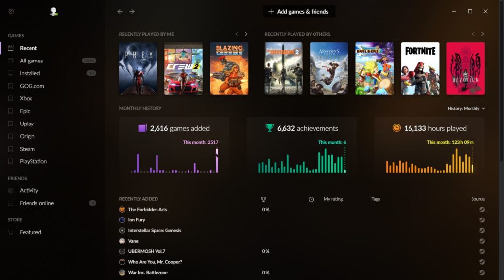 A legelső fül, ami alapértelmezésben fogad bennünket indításkor az a „Recent” tab (természetesen beállíthatjuk, hogy mit lássunk először). Gyors áttekintést kapunk arról, hogy mi magunk mivel játszottunk nemrégiben, és barátaink közt mik voltak most elővéve. Ezen belül egy összegzést láthatunk teljesítményünkről (összes játék a könyvtárban, achievementek, játszott órák száma) napi, heti vagy havi lebontásban.