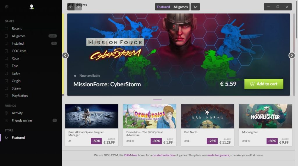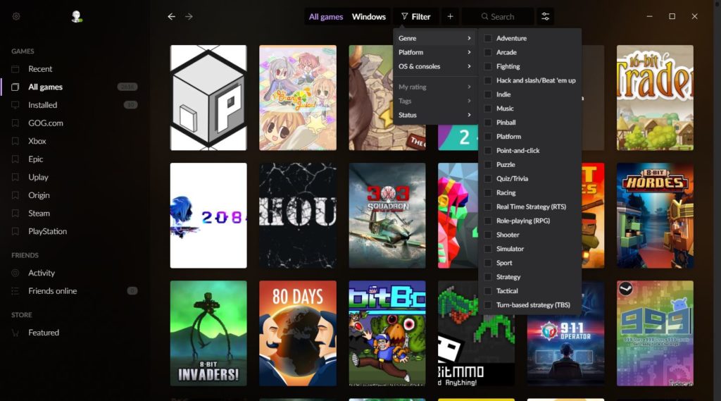 Az „All games” fülre kattintva az összes kapcsolt fiók játékát áttekinthetjük, és filtereket alkalmazva bizonyos téma szerint megszűrhetjük őket. Jelenleg elég sok opció van benne, de nem mindegyik működik megfelelően. Például a Warhammer 40.000: Dawn of War II – Chaos Rising ugyanúgy megtalálható a fighting kategóriában, mint a Street Fighter V. Remélem lesz lehetőség később saját szűrőt beállítani vagy esetleg olyat létrehozni, ami kettő vagy több már meglévő szűrőt kombinál (pl.: indie + RPG).