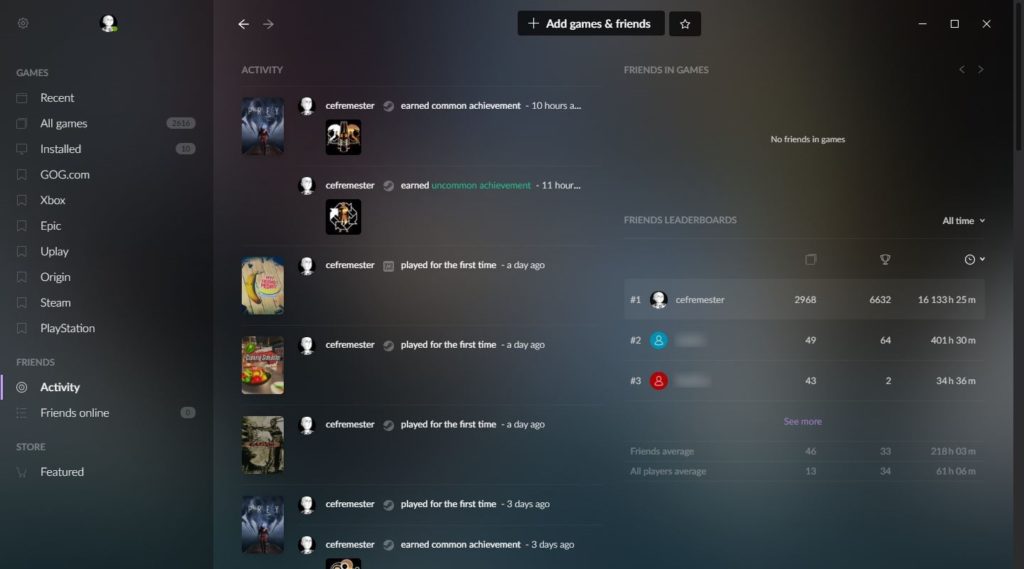 Végül a Steamből ismerős „Activity” tab is bekerült, ami listázza az általunk és barátaink által elért achievementeket, és összehasonlítja velük az összes játékunk számát, elért achievementek számát és az összes játékóra számát. Ezen felül átlagot is von a barátlistán lévő adatokból, hogy láthassuk kinek mekkora az a bizonyos e-péló.