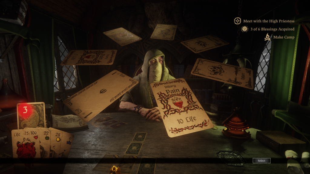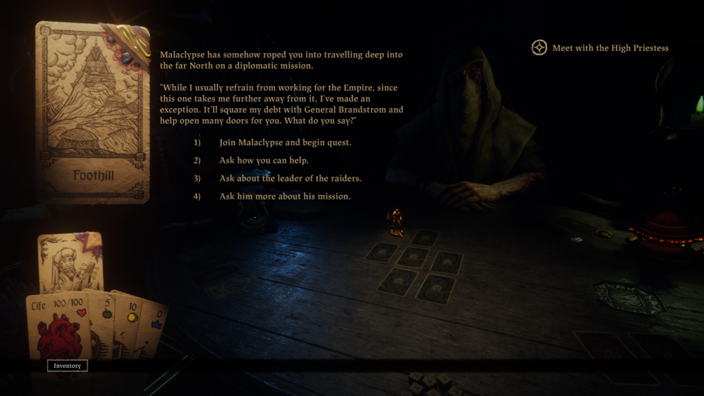 A legtöbb esemény kártya egy eldöntendő kérdést vet fel, melyekre belátásunk szerint válaszolhatunk az adott opciók közül. Dönthetünk úgy, hogy nem foglalkozunk vele és így nem érhet minket baj, ám akkor a jutalom lehetőségéről is lemondunk. Dönthetünk úgy, hogy belemegyünk, de ha a feladat kockázatos, bizony csúnyán pórul járhatunk. Szinte minden esetben négy lap közül kell kiválasztanunk egyet, így döntve el, hogy a cselekvésünk sikerrel járt avagy kudarcba fulladt. Lényegében „itt a piros, hol a piros” stílusú keveréssel az osztó átrendezi a lapokat és várja, hogy válasszunk. Ha sikerrel járunk és a kártya „új lap” volt a pakliban, megnyerjük az érméjét mellyel jogot kapunk arra, hogy kivegyük a többi közül és ne jöhessen elő újra. Persze érdemes olyan lapokat választanunk amik könnyen megoldhatóak vagy csak előnyünk származhat belőlük, ám figyelni kell arra is, hogy ha nincsen „új lap” a paklinkban aminek az érméjét megszerezhetjük, a későbbi pályákon bizony nem biztos, hogy elég erősek leszünk az akadályok legyőzésére. Pontosan ez az amitől a játék különleges, más mint egy szokványos kártya vagy szerepjáték. Itt nem elég jó paklit összerakni és szerencsésen kihúzni a lapokat, itt ügyesnek is kell lenni, ha csatára kerül a sor.