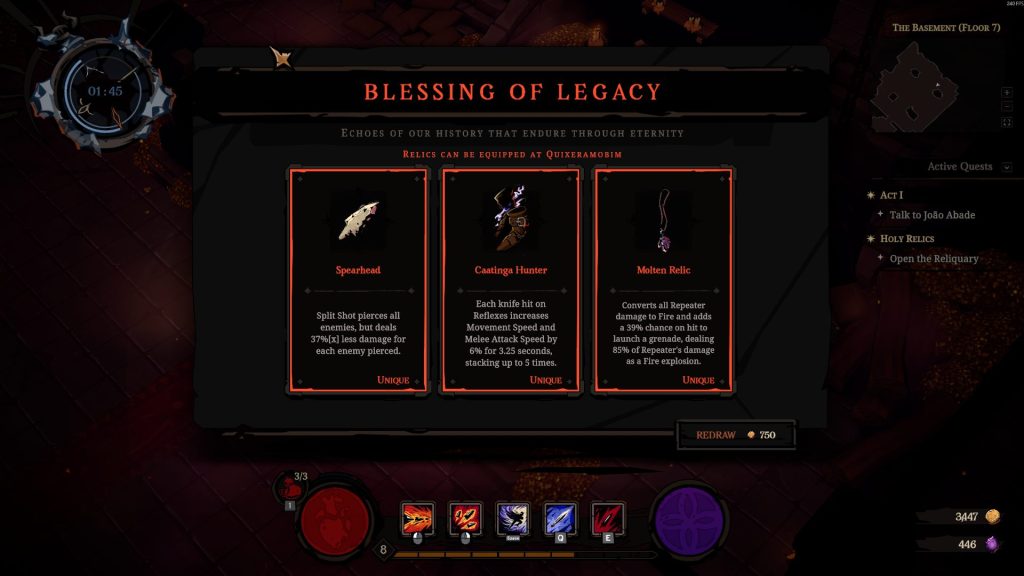 A rengeteg vérrel, és egyéb más testnedvvel átitatott ruhánkat néha jó lenne cserélni is. Itt lép be a képbe a META progresszió első lépcsője, ruhák és relikviák. Ezeket játék közben, nagyobb ellenségektől, vagy egyes boltokba megszerzett pénzért vehetünk, tisztességes ARPG-hez híven, a statisztikák random választódnak ki, és minden tárgy valamilyen képességünket erősíti, vagy teljesen újra definiálja azt.