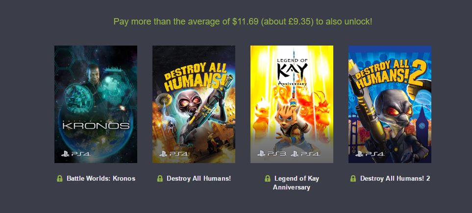 Ha megugorjuk az átlag árat (ez a jelenlegi pillanatban 11.69 dollár, ami folyamatosan változik, attól függően ki melyik csomagot vette meg előttünk, így lehet ennél kevesebb vagy több is valamivel) az előbbieken kívül hozzáadódik a Destroy All Humans! 1. és 2. része is, a Battle Worlds: Kronos és a Legend of Kay Anniversary is.