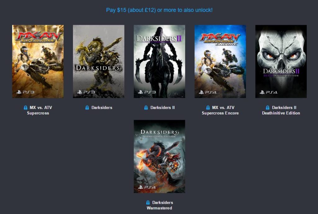 Ha esetleg ez nem lenne elég, akkor a maximális 15 dolláros összegért bezsákolhatjuk az MX vs. ATV Supercross, Darksiders, Darksiders II címeket PS3-ra, vagy ezek feljavított, bővített változatait PS4-re.