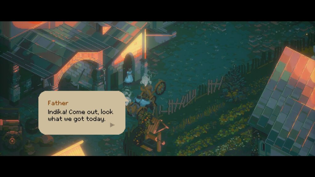 Segítséget keresve ketten vándorolnak a vidéken, hogy megtalálják azt a helyet, ahol a férfi úgy véli, hogy Isten meggyógyíthatja. Az Indika nem vesztegeti az időt, hogy kihúzza a hagyományos történetmesélés szőnyegét a lábunk alól: Több pixel stílusú szekvenciával szakítja meg a játékmenetet, ahol pontokat gyűjthetünk (amelyekről a játék kifejezetten azt állítja, hogy semmi hasznuk) illetve Indika múltját is ilyen stílusban mutatja be nekünk a játék.