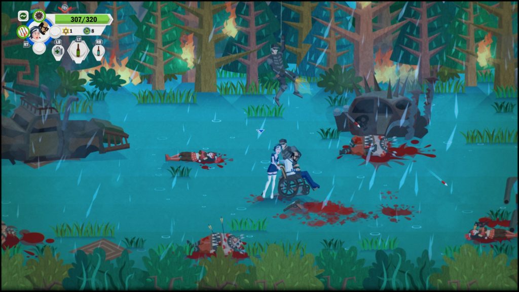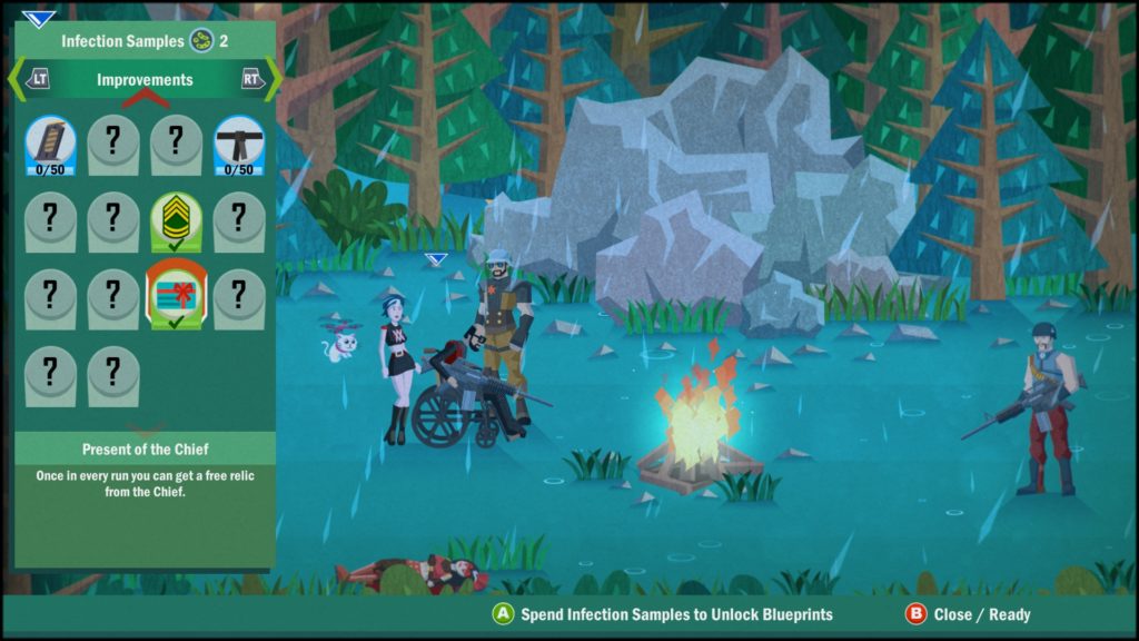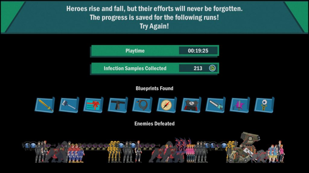 A rogue-like elem ott jön be, hogy elhalálozás esetén, odaveszik a karakter és minden összegyűjtött fegyverünk, relikviánk, készletünk is. Visszakerülünk a táborba, ahol kezdhetjük újra az egészet. Minden alkalommal új pályát generál a játék, így a hullarablás nem kivitelezhető, ám nincs veszve minden! Ellenfeleink különféle tervrajzokat dobálnak, melyeket a szintén az ellenfelekből hulló, zombi-vírus mintákkal oldhatunk fel. Ezeknek annyi az értelme, hogy vagy passzív bónuszokat adnak (pl extra életerő, nagyobb sebzés, nagyobb tár a fegyverekben), vagy a pályákon található fegyverek illetve magunkra aggatható csecsebecsék mértékét növelik meg. Mivel teljesen random generált a játék, így sosem tudjuk milyen ellenfelek várnak ránk, illetve, hogy milyen módon fogjuk tudni őket kiiktatni. A pályákon elszórva találhatunk pihenőket, ahol kicsit feltankolhatunk, illetve az említett tervrajzokat is feloldhatjuk. Ezeken felül találhatunk peteket is, akik különféle képességekkel irtják az ellent nekünk (a macska például mindenkit szétkarmol aki a közelünkbe ér, míg a jeges maci hógolyóval lassítja őket), közölük egyszerre több is aktív lehet. Alkalmazhatunk kicsit zúzósabb képességeket is, az alapvető csapkodáson kívül, ezekből is találhatunk a pályákon elszórva extrákat.