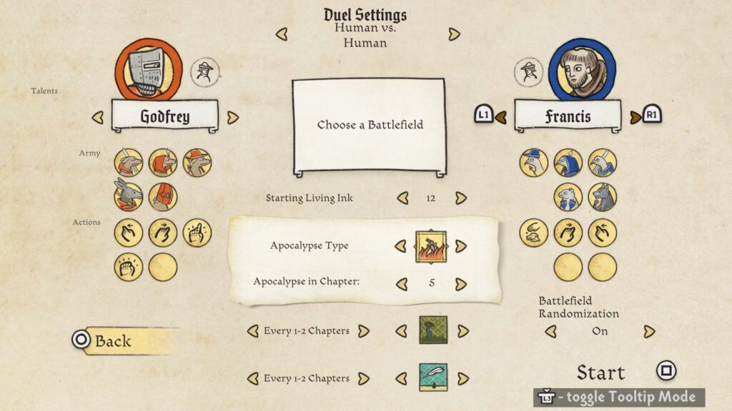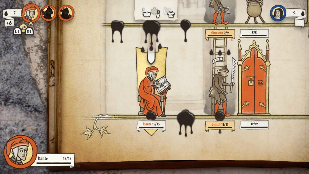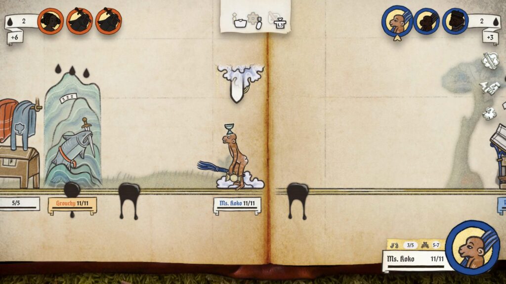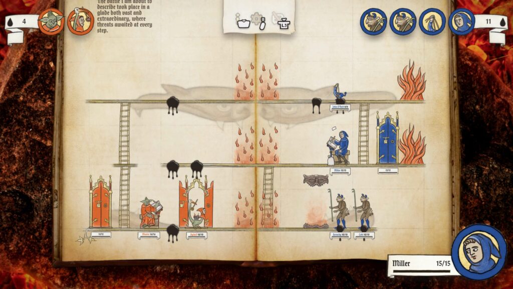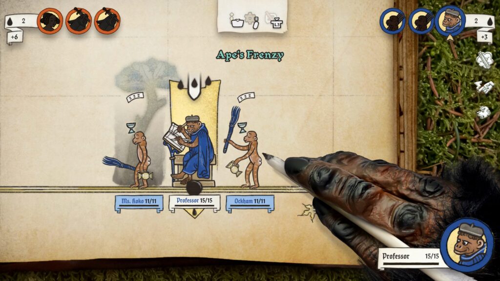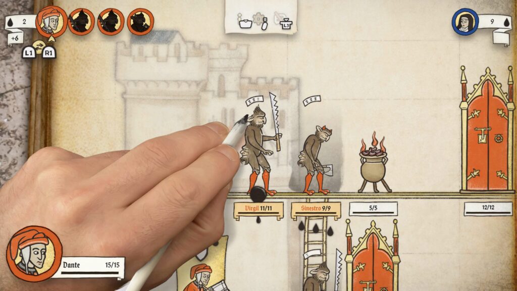 Meg is lepődtem (szintén jó értelemben), amikor a kézzel rajzolt látványvilág egyszer csak kiegészült egy élőszereplős videóval, amelyben egy szerzetes és egy lovag ültek le, egy és ugyanazon asztalhoz. Itt tintát és pennát ragadtak kezükbe, és bele is csaptak egy Yu-gi-Oh… akarom mondani Inkulinati-párbajba. Már magában ez a jelenet egy teljesen szürreális és vicces pillanatot okozott számomra, azonban a móka a komolyságban itt bizony nem ért véget.