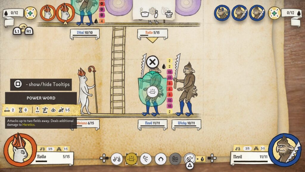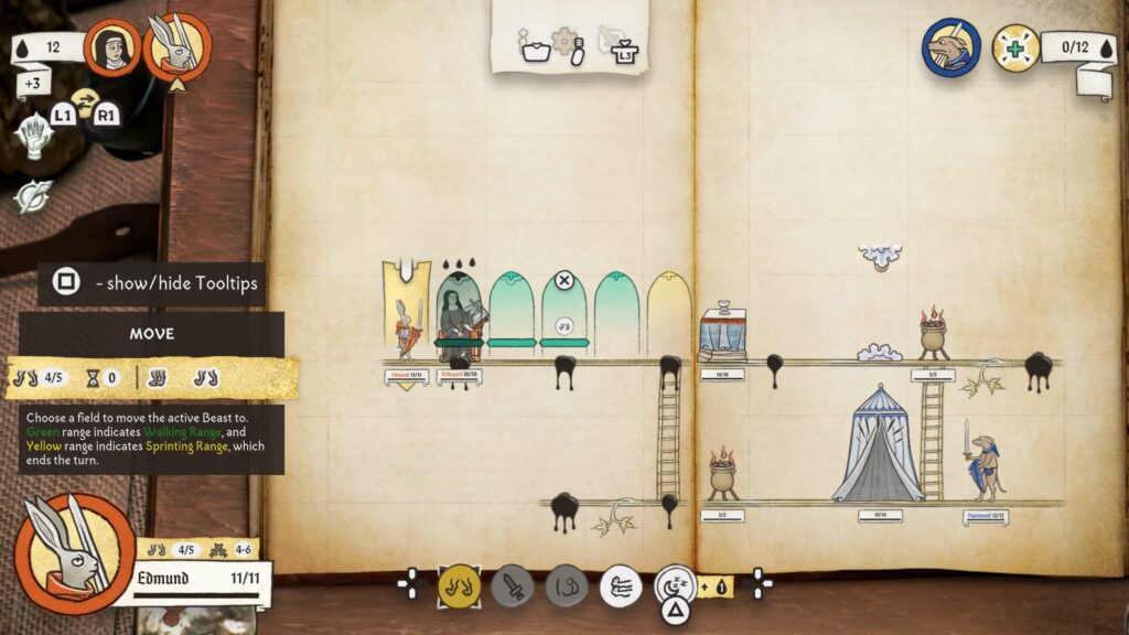 Minden kör elején választhatunk, hogy a seregünkben lévő teremtményekkel lépni vagy támadni szeretnénk, kvázi mint a sakkban. Minden ilyen entitás adott távolságban tud majd csak közlekedni és csatát vívni, de természetesen ha távolabbi ellenfeleket szemeltünk ki, akkor sem kell szomorkodnunk, hiszen az íjászok vagy akár a nyuszikat dobáló izomagyú nyulak elég messzire tudnak célozni. Minden rajtaütés kiválasztásakor egy vízszintes sáv jelenik meg, amelyben lentről felfelé haladva a sebzési számok láthatóak.
