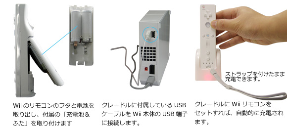 Nincs is más dolgunk, mint a Wii Remote-ot elhelyezni a töltőben, rádugni a Wii USB kimenetére és voálá, máris töltődnek az elemek. A közel három és fél órás töltési idő körübelül 25 órányi játékot tesz lehetővé, ugyanis ennyi idő után merülnek ki a feltöltött erőforrások.