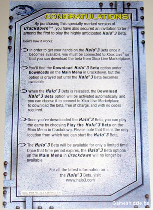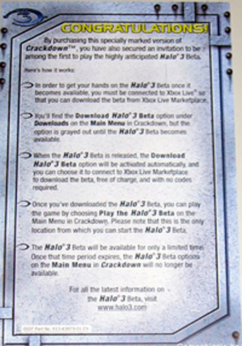 A srácok a megjelenő Crackdown dobozkájában rejtik el a regisztrációhoz szükséges leírást és CD-kulcsot, tehát tehetősebb egyének akár így is hozzájuthatnak a tesztelési lehetőséghez. Az egyik német lap, a Shizzle Games már beszerezte a maga példányát, amelyben annak rendje és módja szerint ott lapult a Halo 3 bétateszthez szükséges leírás és kulcs. Most erről tekinthettek meg pár képet.