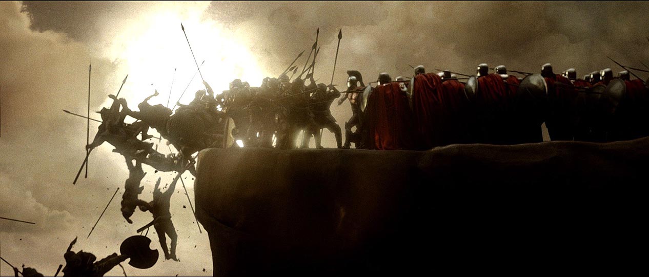A rövid, alig fél órás felvezetés után a film végezetéig a csata fantasztikusan megkomponált jeleneteiben élvezkedhetünk. A spártai hoplita hadsereg Leónidasszal az élen a szövetséges erőket összegyűjtve mindegy 7-8 ezer fős hadsereggel állt fel a közel 200 ezres barbár haderővel szemben. Innentől kezdve nincs megállás. Szemtanúi lehetünk a görög falanx hihetetlen átütőerejének, a Mátrixosan lelassított jelenetek, a repkedő karok, a már-már képünkbe fröccsenő vér pedig olyan hatást keltenek, mintha mi magunk is szerves részei lennénk az ütközetnek. Ezt a felemelő érzést tovább erősíti a fotorealisztikus látványvilág, amely hűen adja vissza a képregényhangulatot, melyet egy igen masszív narrációval fejeltek meg.