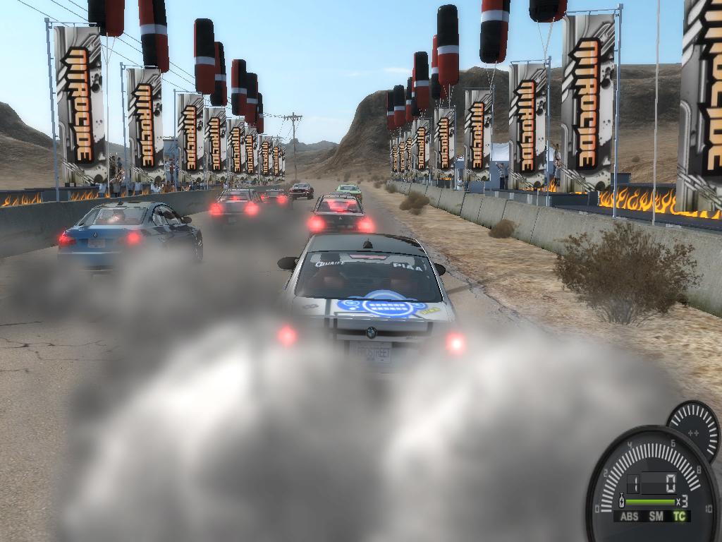 A piroslámpák kialvása előtt hatalmas füst lepi el a START-ot. Először nem értetettem, miért is égetik a gumikat az ellenfelek, majd rá kellett jönnöm, hogy ezt bizony azért csinálják, hogy az indulásnál jobban betapadjon az autó, így könnyebb lesz az elindulás is. Ha már a füstnél tartunk, akkor nagyon sokáig ezen új effekt bekerülésével azonosítottuk a játékot. Nos, valóban látványos, önmagáért beszél az alant is leshető kép.