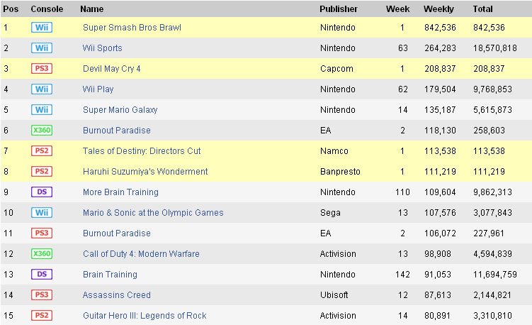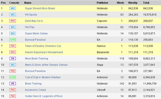 A VGCharts jóvoltából megérkezett a február másodikával záródó szoftver összeladási lista.A lista jelenlegi éllovasa a Super Smash Bros Brawl, mely Nintendo Wii-n kaszált hatalmasat. A táblázat második helyezetje a Wii Sports lett, míg a harmadik a nem rég debütált Devil May Cry 4, melynek PS3 verziója közel fél órán keresztül telepít. Volt is ebből felháborodás.