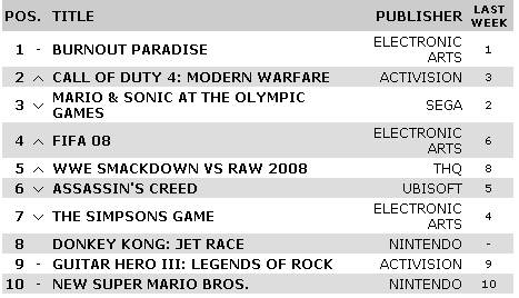 Az egy héttel ez előtti brit szoftver eladási lista élén nyitott a Burnout Paradise és a legfrissebb adatok szerint azóta el sem mozdult onnan, ám a második és harmadik helyért vívott harcban ezúttal a Call Of Duty 4 kerekedett felül és ezzel meg is előzte a múlt héten még második helyen tanyázó Mario & Sonic At The Olympic Games-et, így utóbbinak most csak a harmadik hely jutott. A FIFA 08 pedig egészen a 4. helyig verekedte vissza magát a hatodik pozícióból a brit eladási listán. Íme a múlt heti UK top 10.