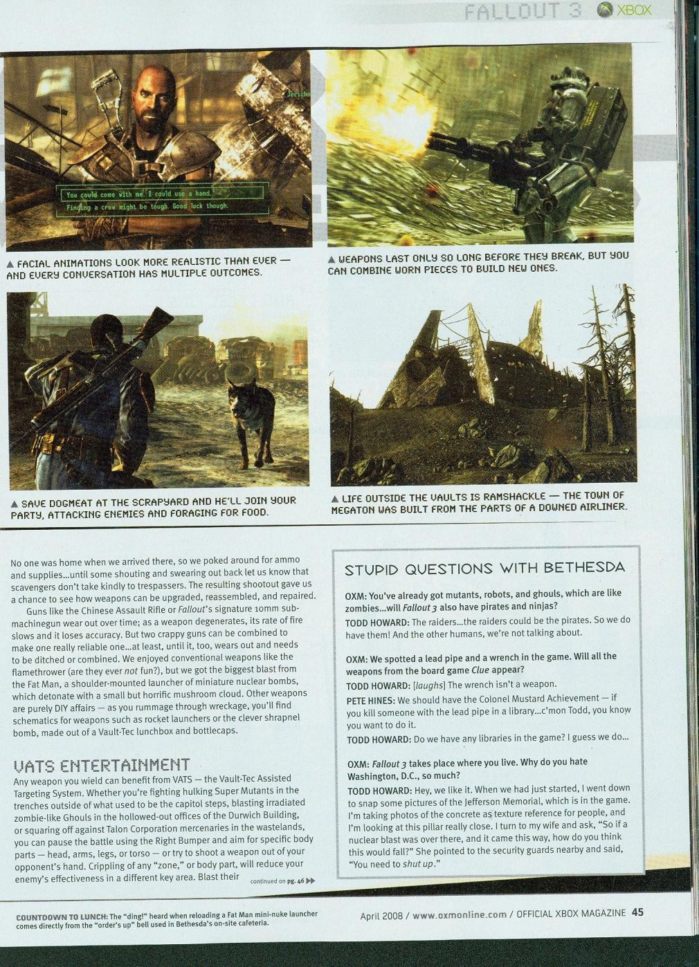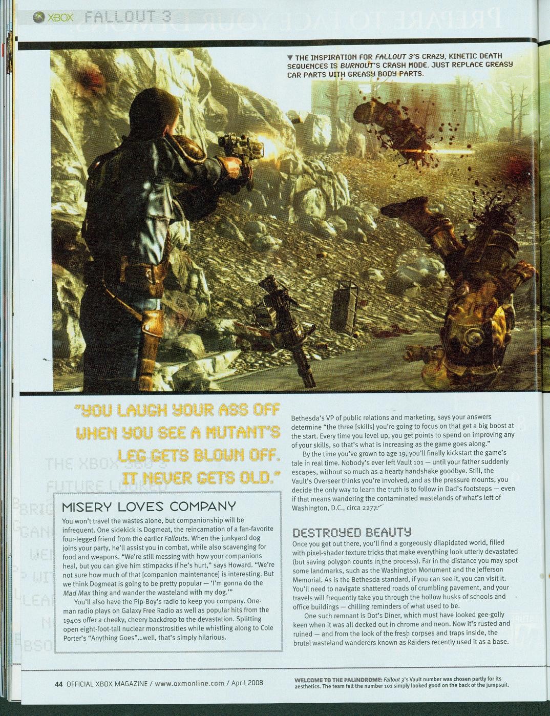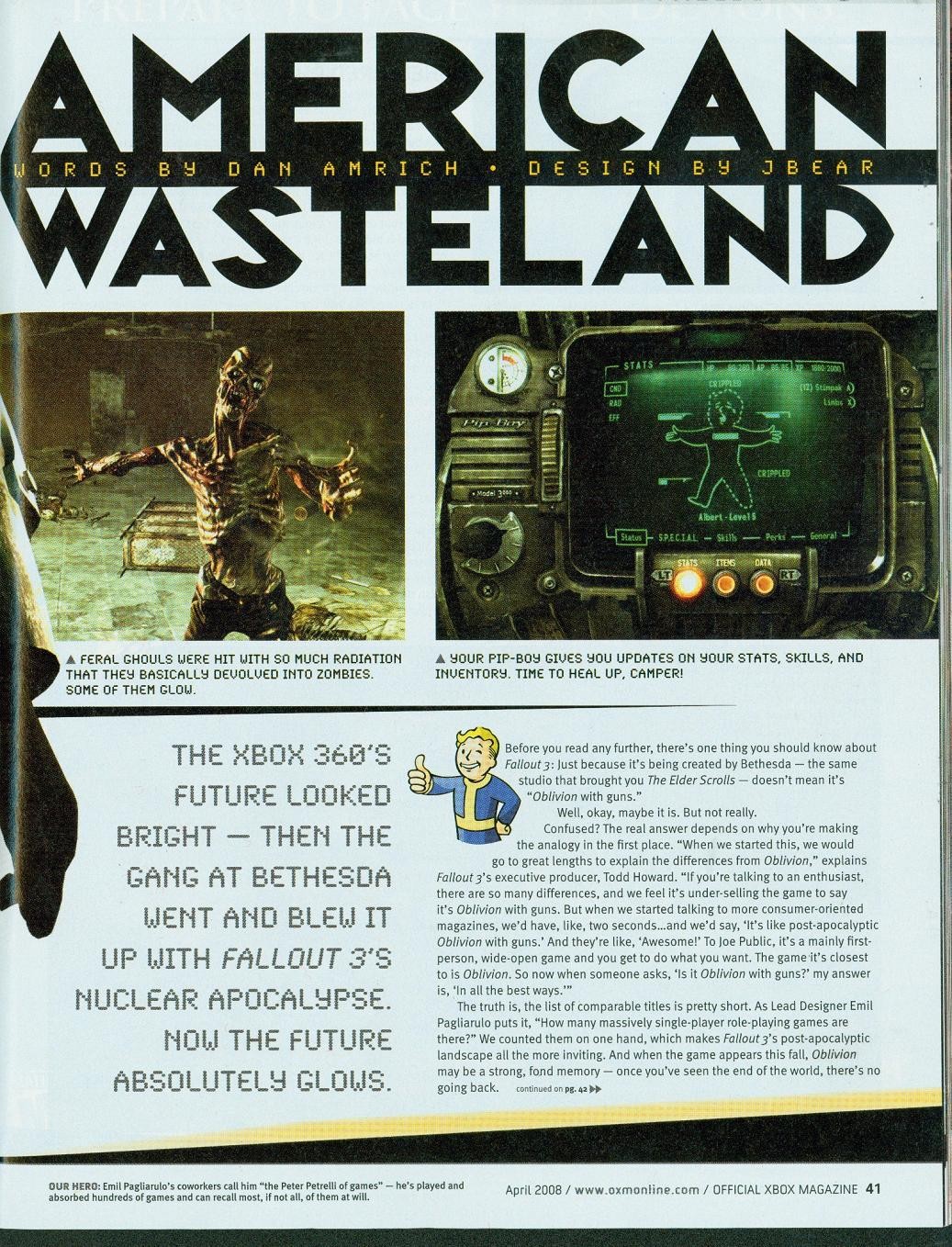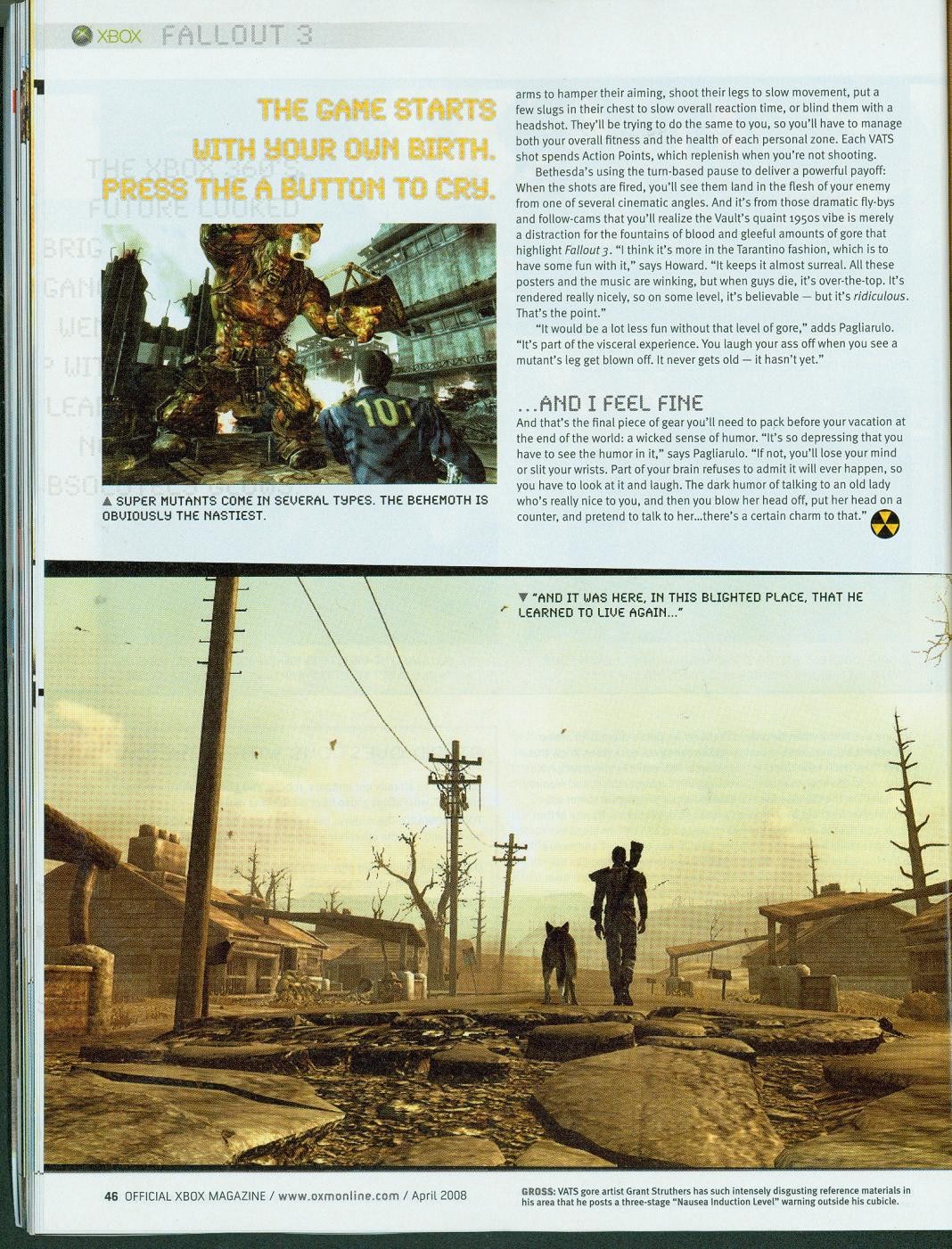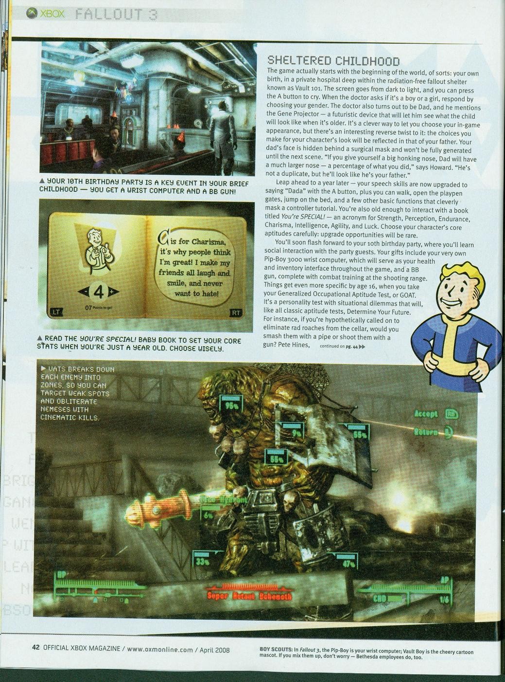 A hat oldalas cikk nem csak vadonatúj képeket, de friss információkat is szolgáltat a nukleáris apokalipszis utáni esztendők sivár életét bemutató Fallout 3-ból. A sorok között bogarászva például megtudjuk, hogy a harmadik epizód hősünk születésével kezdődik. Az egyetlen fertőzetlen város, Vault 101 kórházának orvosi ágyán látjuk meg a napvilágot, majd miután a kontroller A gombját lenyomjuk a doktor végre örömmel nyugtázza, hogy az újonnan született csecsemő sír és végre életjelet ad. Amikor a szülésztől érdeklődik az anyuka, hogy fiú vagy lány csemetéje született, akkor választhatjuk ki, hogy a poszt-apokaliptikus világ megmentője nő vagy férfi legyen. Persze még meg kell tanulnunk járni, olvasni, beszélni, egyszóval a játék valóban a kezdetektől követi majd végig az eseményeket. Például tizedik születésnapunkat is megünnepelhetjük. Ekkor kapjuk meg a későbbi inventory-ként szolgáló Pip-Boy 3000-es számítógépünket, illetve a BB csúzlinkat, amivel a lövészet mesterségeit sajátítjuk majd el.