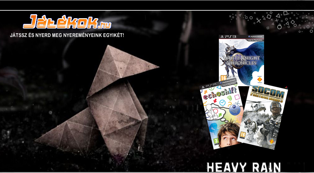 Aktuális akciónkban a következő játékokat sorsoljuk ki: Heavy Rain (PS3), White Knight Chronicles (PS3), EchoShift (PSP), SOCOM: Fireteam Bravo 3 (PSP), The Eye of Judgment Legends (PSP).
