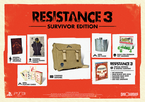 A Resistance 3 két különböző gyűjtői kiadványt kap majd. A Special Edition egy csinos fémdobozban érkezik, ami az alapjáték mellett a fent említett összes előrendelő csomagot tartalmazza majd, a játék pedig egy bakelitre hajazó Blu-Ray lemezen érkezik majd. A Survivor Edition kicsit tartalmasabb pakknak ígérkezik, ugyanis alapból tartalmazni fogja a Special Edition tartalmát, egy pofás táskát, játékkártyát és még sok egyebet.