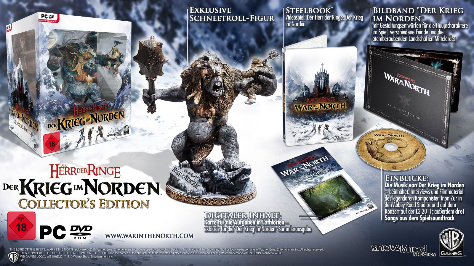 A játék mellé kapunk egy harcoló törpét és trollt ábrázoló szobrot, egy War in the North képes könyvet, valamint egy DVD-t, melyen a játék zenei anyagát készítő csapattal készült interjúkat tekinthetjük meg, illetve három zeneszámot meg is hallgathatunk. Végezetül kapunk még egy DLC-kódot is, melyet felhasználva a Lothlorien challange térképet tölthetjük le.