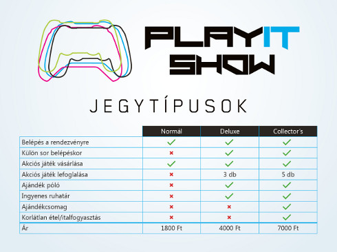 Most a normál jegy mellett két korlátozott számban kapható, exkluzív ajánlat is vár a látogatókra. A Deluxe jegy 4000 forintba kerül, amelyhez kapsz egy ajándék pólót (választható mintával és mérettel), ingyenes számodra a ruhatár, külön sorban léphetsz be a rendezvényre (szinte várakozási idő nélkül), valamint előre lefoglalhatsz 3 játékot a PlayIT alkalmi webshopjában, amelyet a helyszínen fizetve bármikor átvehetsz az erre kijelölt standnál. A Collector's Edition a valódi luxust kedvelő gamerek tökéletes választása. Ennek ára 7000 forint, ehhez is jár ajándék póló (szintén választható típussal és mérettel), ingyenes ruhatár, külön sorban gyorsított bejutás, sőt 5 terméket foglalhatsz le magadnak a PlayIT shopjában. Ezenfelül meglepetés PlayIT-ajándékok és a VIP részlegen korlátlan étel-italfogyasztás is biztosított.