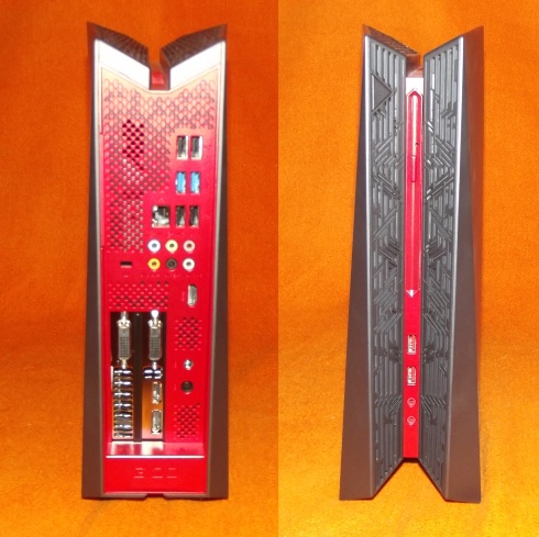 Mint egy konzol. Jól mutat a nappaliban a tévé mellé állítva is. Kívülről egy igen agresszív kinézetű testvére a méltán híres Sony PS4-nek. Míg nem kapcsoljuk be, addig sem néznek ki rosszul a hűtőrácsok, de amint a gép elindul és világítani kezd az előre beállított színben, akkor válik láthatóvá, hogy micsoda kis szörnyeteg lett bezárva ebbe a meglepően karcsú és kellemes kinézetű dobozba. A ventilátorok és hűtőbordák elhelyezése remek lett, ugyanis nem záródott be sosem a levegő, viszont a hangját sem hallatta túl gyakran. Két alkalommal sikerült a ventilátoraiból komolyabb hangot előcsalogatnom, amikor 60%-ra égetve a processzort elkezdtem valami gyengébb játékkal játszani, vagy ha kikapcsoltam – ilyenkor lefújja a levegőt az alkatrészekről. Mivel valaki még régebben úgy döntött, hogy a gamer szín az az agresszív vörös, ezért a csatlakozók elöl és hátul ilyen borítást kaptak, ami igazán durva külsővel áldja meg tesztalanyunkat.