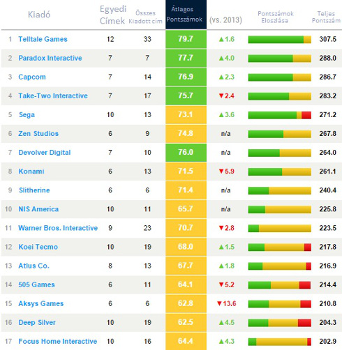 Az Activision Blizzard van ismét a lista alján, egyszerű indokkal: túl sok borzalmas játékot adnak ki. 2014-ben 8 olyan címet is megjelentettek, amelyek nagyon gyenge értékeléseket kaptak, és ezt semelyik másik kiadó nem mondhatja el magáról. De ha külön nézzük a két céget, akkor a Blizzard értékelések alapján átlagosan 85,5%-ot kap a címeire. Míg az Activision is javult valamennyit, de ami gyengén muzsikál náluk, az nagyon gyenge értékeléseket is kap.