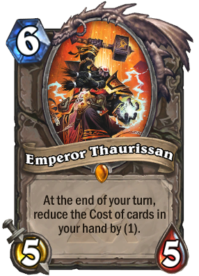 Ha az első szárnyat kiütöttük, akkor egy legendary Emperor Thaurissan lapot kapunk. 6 mana, 5 sebzés, 5 élet és a képessége, hogy minden kör végén a kezünkben lévő lapok manaigényét 1-gyel csökkenti. Több ilyen effekt egyidejűleg összeadódhat, és a kártya halálával nem szűnik meg a manaigény csökkentése a meglévő lapokon.