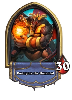 Első ellenfelünk Razorgore the Untamed. Egy 0/1-es Corrupted Eggel az asztalon fogad bennünket, ami majd a csata fő részét is képezi majd. Hősképessége, a The Rookery egy 1 manás auto-cast varázslat, ami annyit csinál, hogy minden az asztalon lévő tojásnak ad 1 életet és leidéz egy újabb tojást. A tojások amint elérik a 4 vagy annál több életpontot kikelnek és mindegyikből egy 7/3-as Chromatic Drake jön elő. Heroic módban jobban eldurvul a helyzet: a The Rookery nem kerül manába; 0/3-ról indulnak a tojások és 5 vagy annál több életnél kelnek ki, amiből 7/7-es Chromatic Drake jön elő.