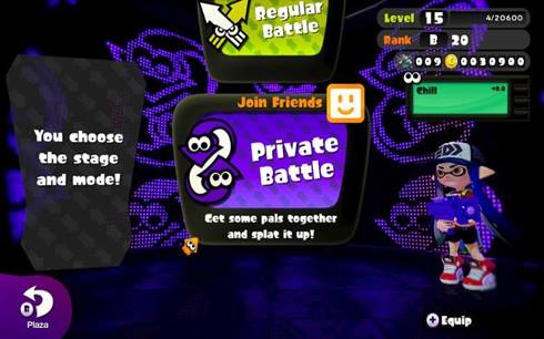 - Private Battle: Végre saját meccseket is indíthatunk! Mi határozzuk meg a játékmódot, pályát és a fegyvereket is. 2-8 játékos lehet a meccseken. A kalsszikus 1-1 vagy 4-4 mellet lesz lehetőségünk 1-2 és 1-4 játékokat is indítani.