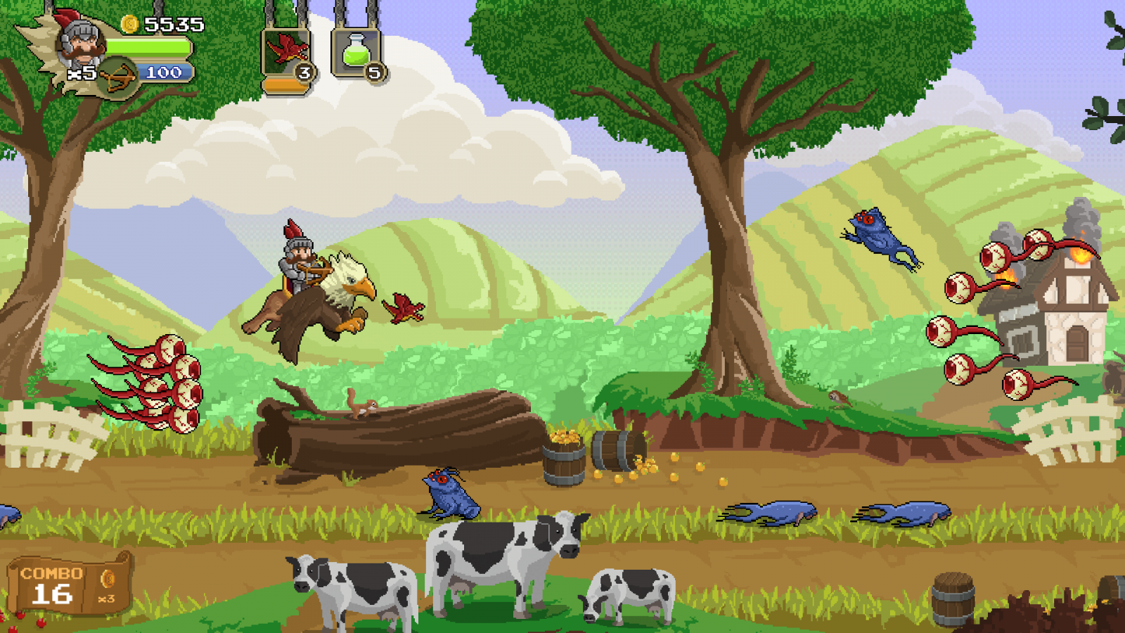 Ebbe hoz egy elég érdekes csavart a játékunk mechanikája, hogy egy gombnyomással meg tudunk fordulni és a másik irányba mehetünk tovább. Ezzel már a játék elején megismerkedtünk a tutorial szekcióban, ahol a történetbe is betekintést nyerünk. A történet gyerekkorunk meséibe illő: Sir Oliver legyőzte a sárkányt, megmentette az egész királyságot, feleségül vette a hercegnőt. A sárkány megölése után mindenki magával vitte az általa választott fegyvert és pénzt, amennyit csak tudott, de főhősünknek már csak egy béna amulett maradt. Pár évet előreugrunk az időben és mivel békeidő van, a hősöknek most nincs dolguk, ezért eléggé le van égve. Kiderül, hogy az amulett és a többi fegyver mind el voltak átkozva és a béke rögtön szertefoszlik, mi pedig felkerekedünk, hogy számszeríjunkkal és griffünkkel rendet tegyünk a világban. Meg kell mondjam, hogy egy ilyen játéktól nem sok történetet vártam, de a karakterek és a bevezető történetek elég jól össze vannak rakva.