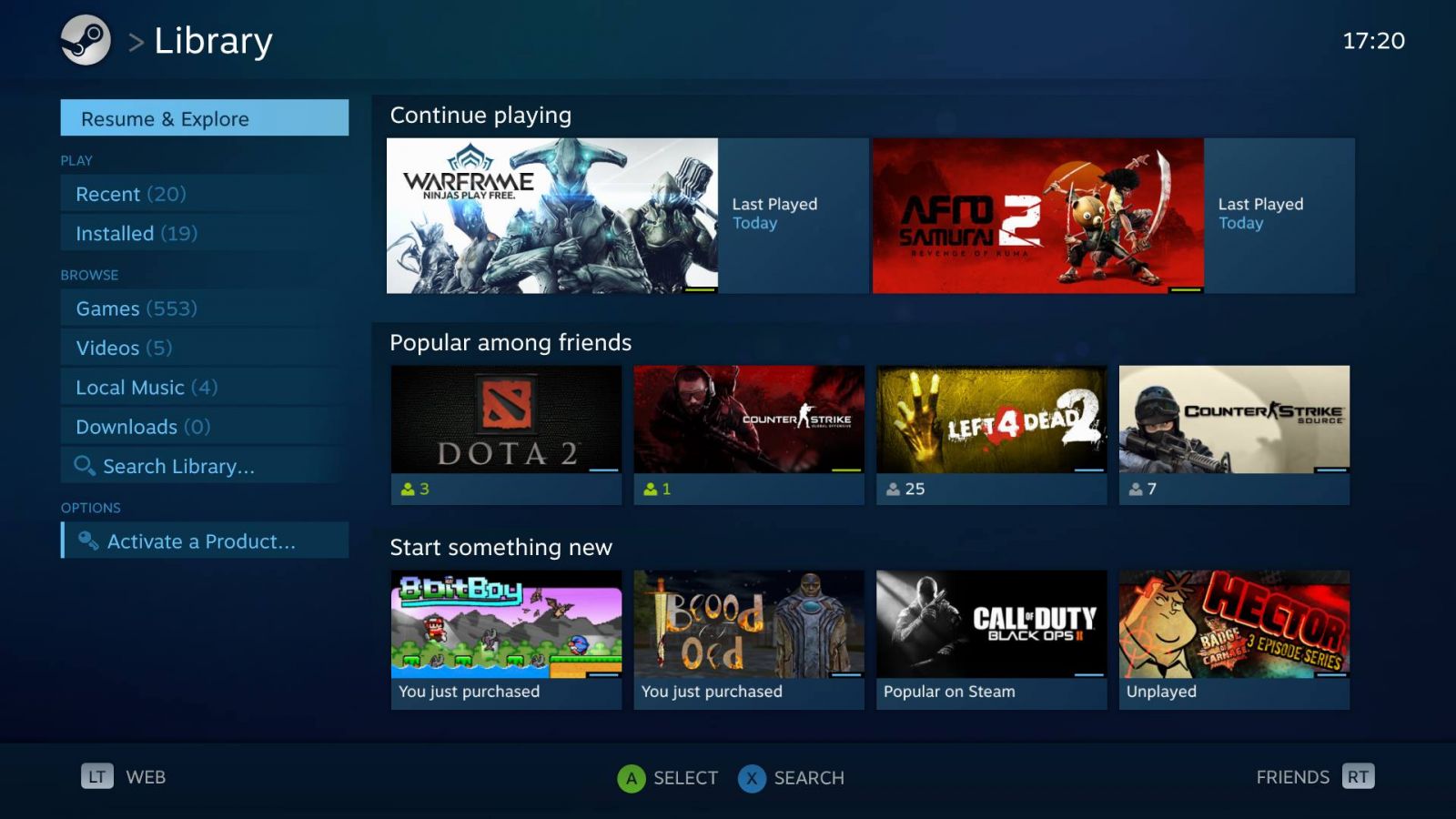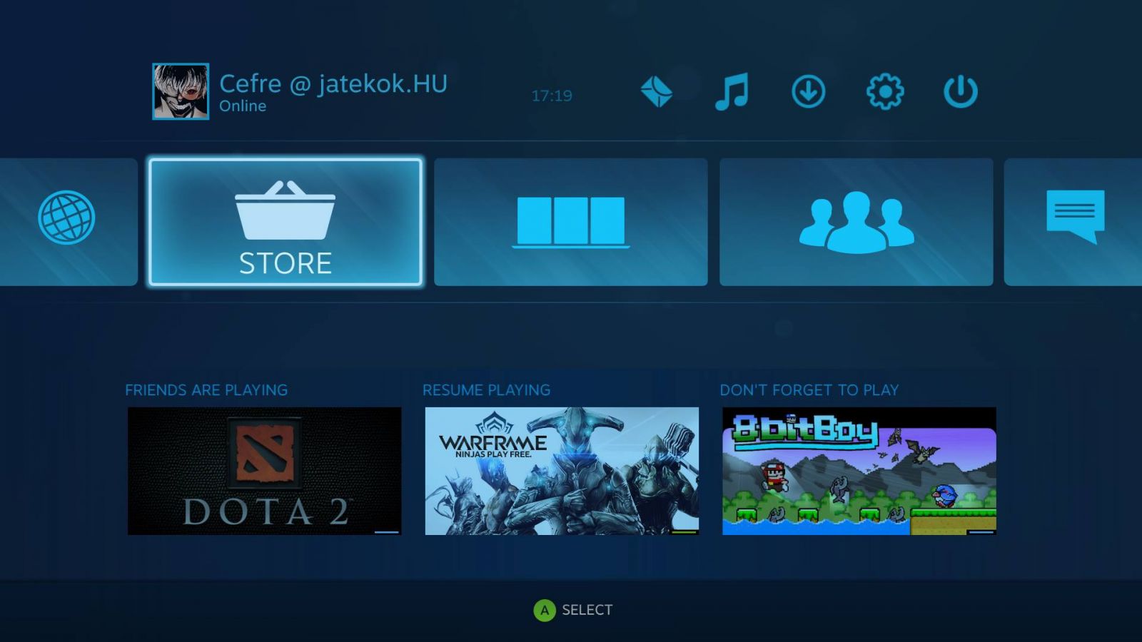 Amint megnyitjuk azonnal szembetűnik, hogy egészen "konzolos" kezelőfelületet alakítottak ki. Ezt nem is tagadja a Valve, mert az a céljuk, hogy a bárhol könnyedén játszhassunk játékainkkal, akár az asztali gépünknél, akár a fotelben a TV előtt. Az első változata ennek a felületnek három menüpontot tartalmazott csak, ehhez képest most már minden funkciót elérhetünk, amit egyébként az alap felületen is megtalálnánk.