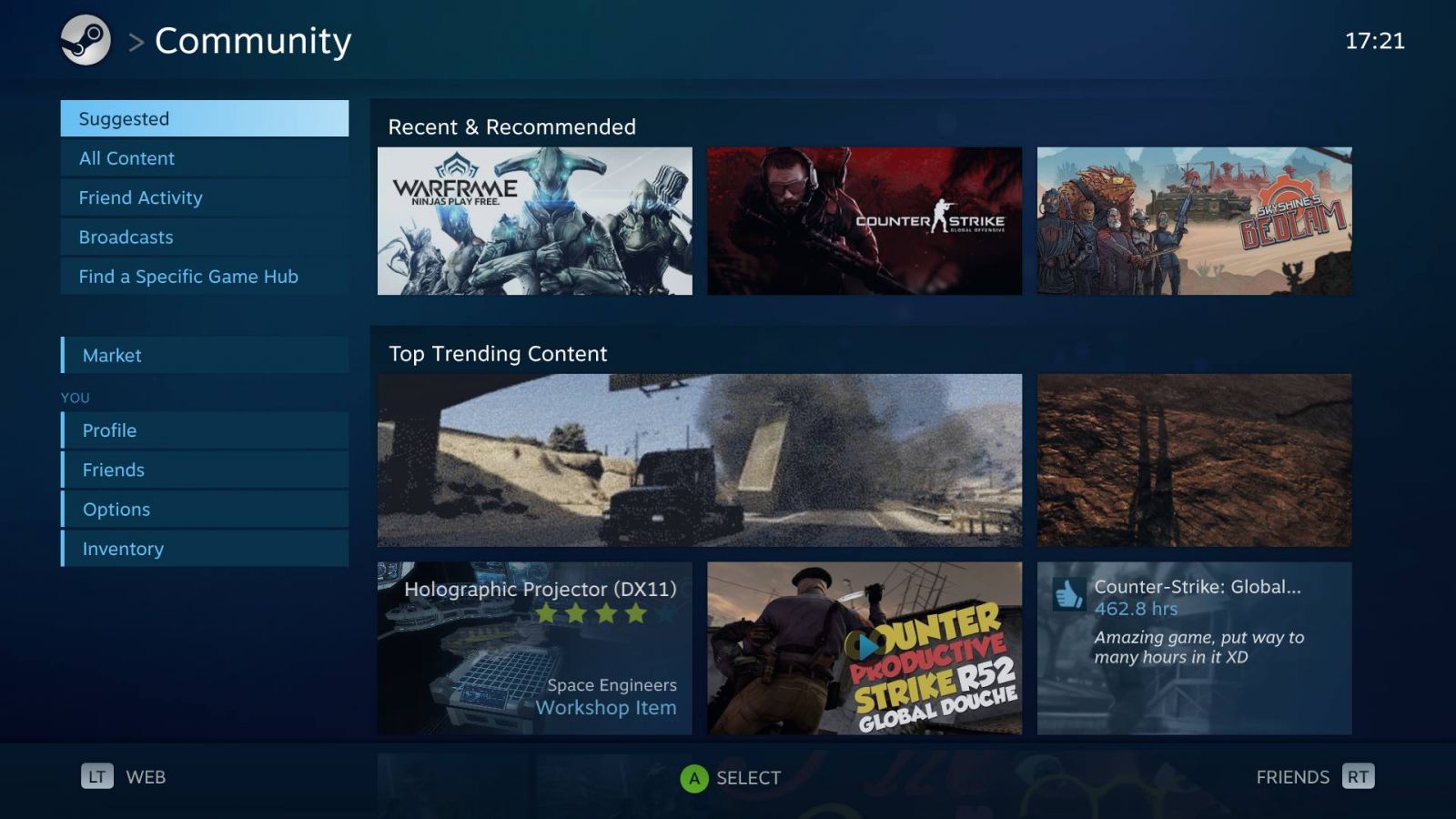 Harmadik menüpontunk a Steam Közösség, ahol a játékokkal kapcsolatos információkat és közösségi tartalmakat találjuk. Itt már helyett kapott a közvetítések menüpontja is, ami szintén könnyedén használható a controller segítségével.