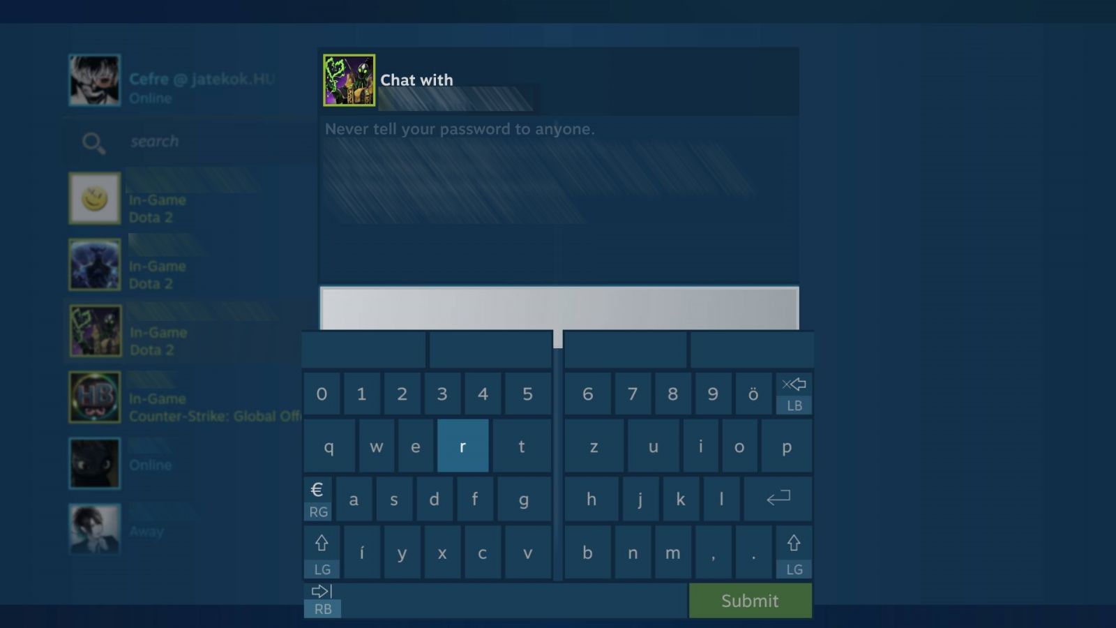 A barátainkkal való csevegés is egy könnyen kezelhető képernyő-billentyűzet segítségével történik. Sok alkalmazással és játékkal ellentétben itt gondoltak arra, hogy mivel a TV előtt elég távol ülünk, ezért nagyobb betűket használ az interfész minden területén, így a csevegés könnyen olvasható, anélkül hogy meresztenünk kellene a szemünket a betűk miatt.