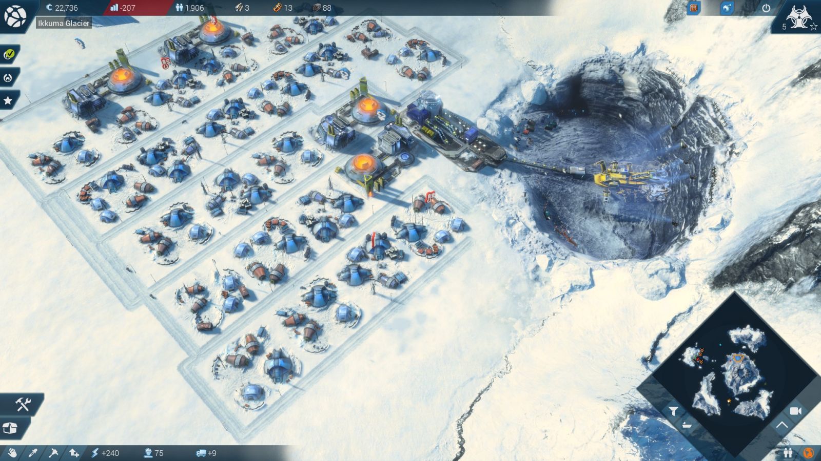 Ezen felül érdekes mechanizmus az, hogy a sarkvidéki területeknek hőmérséklet növelésre van szükségük. Ezt úgy tudjuk elérni, hogy az ipari épületek köré építjük a lakóépületeket, így felhasználva a gyárak által létrehozott hőt. Ez szerintem egy kifejezetten jó megoldás arra, hogy a játékost tudatos építésre kötelezze, ne csak szimplán a látszat miatt építse a települését. Az itt termelt egyedi nyersanyagokat nem tudjuk ezen a szektorban felhasználni, ezért a kereskedelmi útvonalunk segítségével a mérsékelt övbe visszajuttatva azokat késztermékké tudjuk alakítani, amivel az űrprogramunkat tudjuk segíteni. Ebben a szektor rendszerben már most hatalmas potenciál van, de belegondolva, hogy egy ilyen távoli jövőben játszódó történetről van szó, igazából akármivel előállhatnak a készítők területek és nyersanyagok terén.