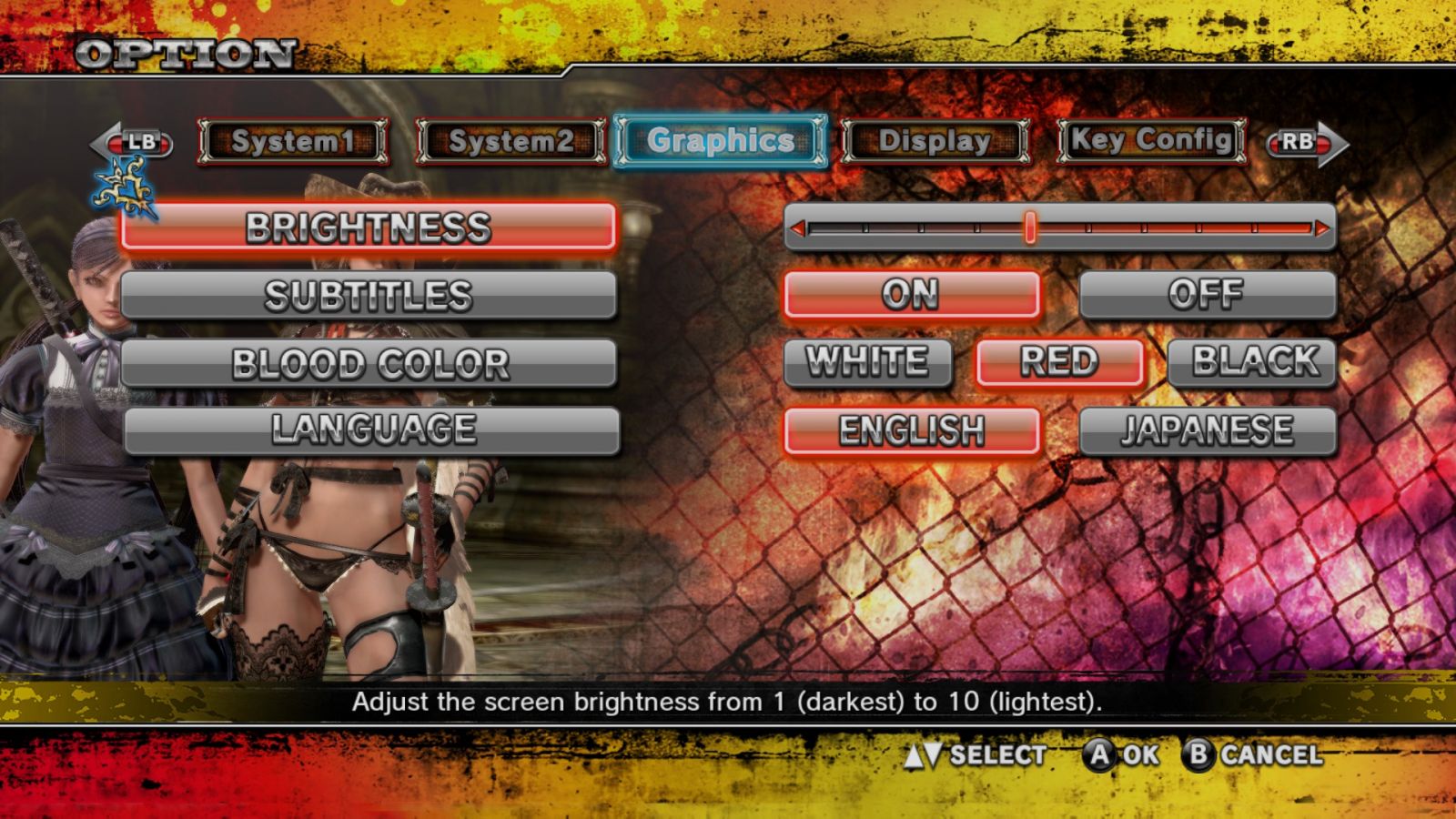 Grafikai beállításoknál sok opcióra nincs lehetőségünk. Fényerő, felirat, vér szín és (amit kevésbé értek miért ebben a menüpontban van) nyelv beállítás kapott itt helyet. Mellékesként megjegyezném, hogy az angol szinkron jelen esetben sokkal jobban tetszett, mint az eredeti japán.